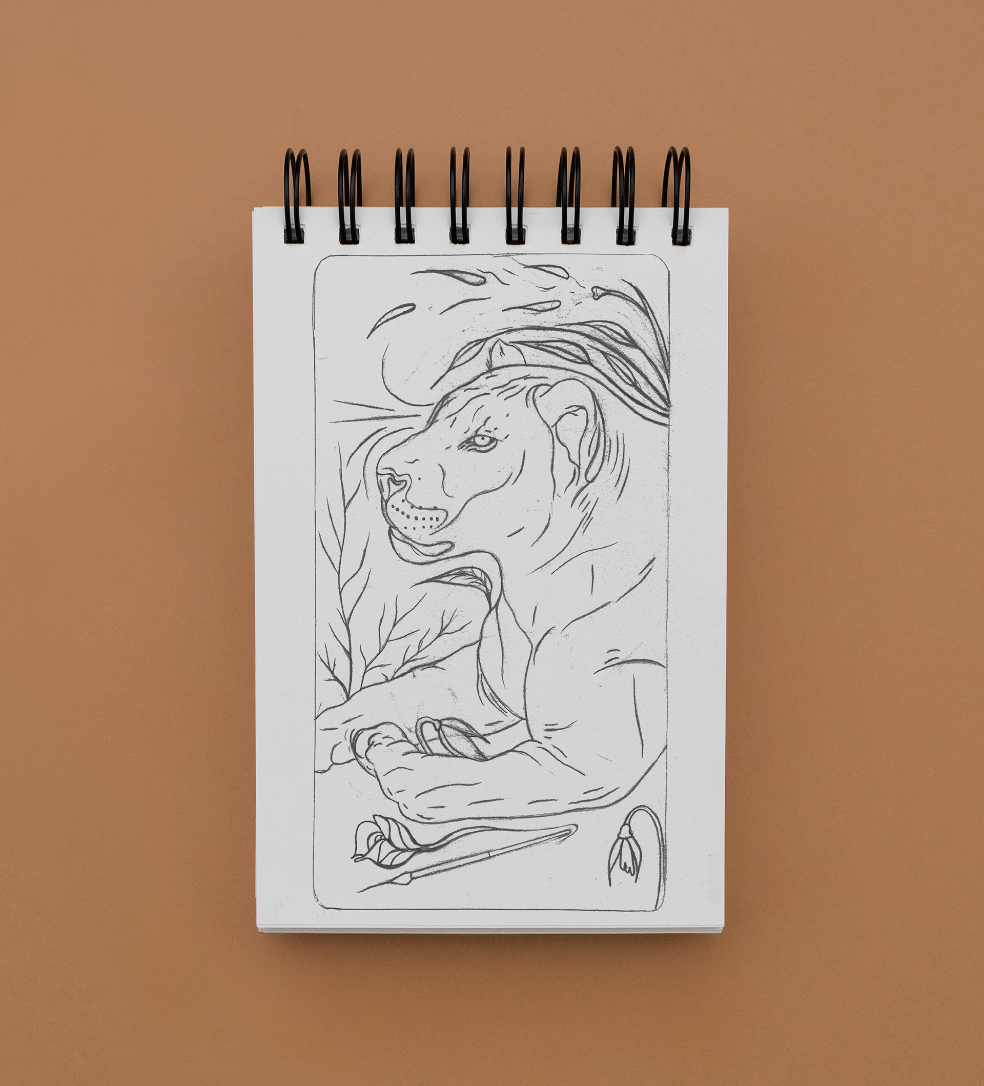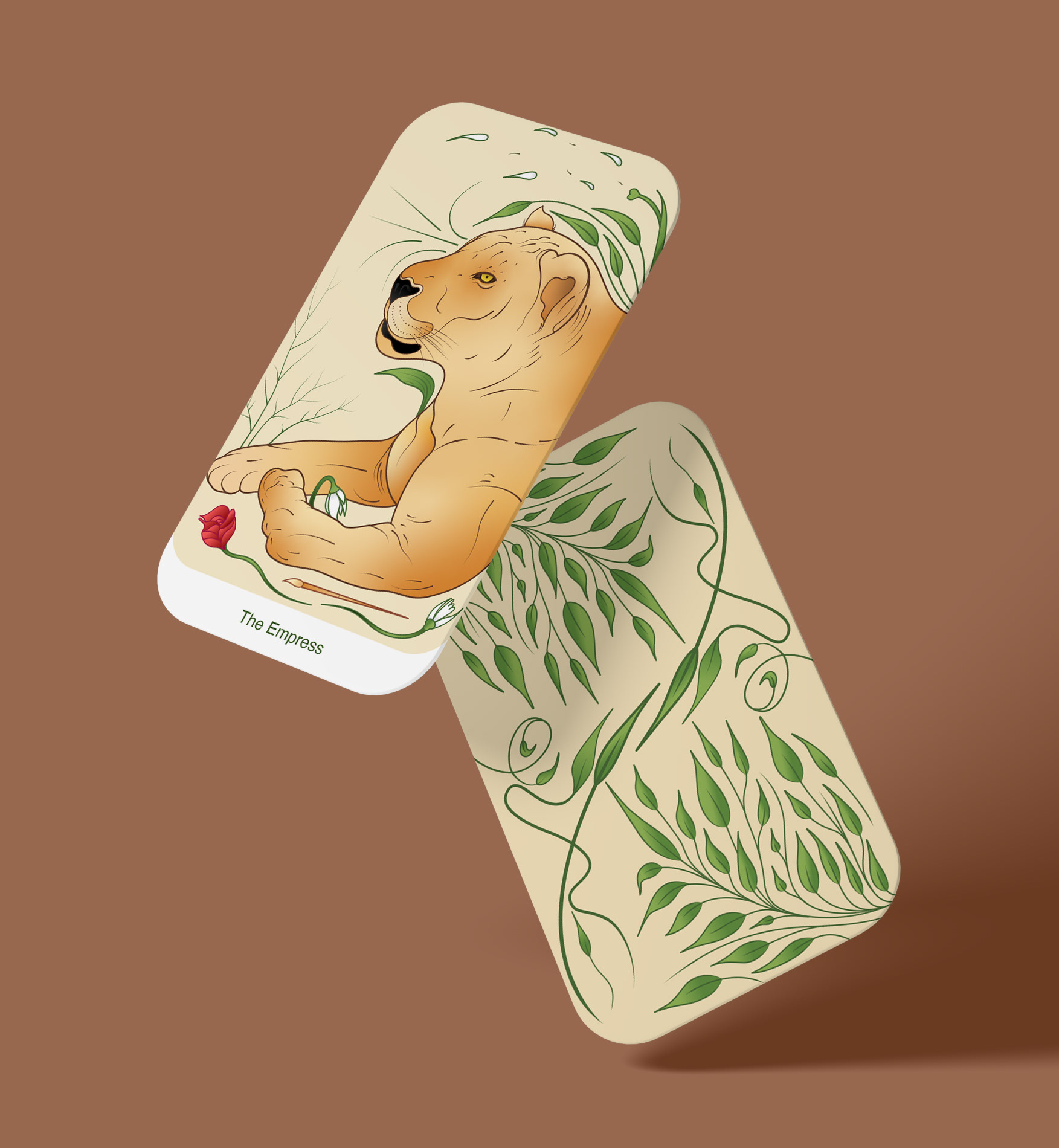 A lion’s leg gently shields a flower, symbolizing protection and motherhood. Leaves reflect natural growth, while a scattered bloom and paintbrush hint at creativity, femininity, and emotional transformation.